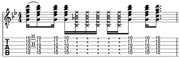 今回、紹介するのはそのKeyのコードGm7のカッティングフレーズです。